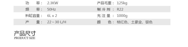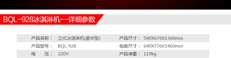 名稱BQL-928立式冰淇淋機 電源220V 功率2.3kw 產量22-30L/H 尺寸540*590*1360mm 重量119kg 規格 其他