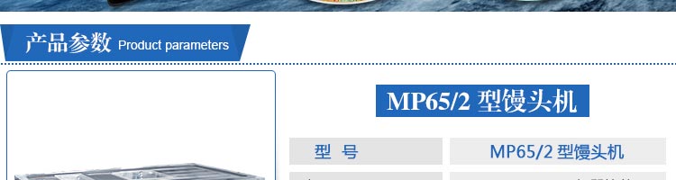名稱MP65/2型饅頭機(jī) 電源220/380V 功率3kw 產(chǎn)量4000個(gè)/小時(shí) 尺寸1300*500*960mm 重量260kg 規(guī)格 其他面團(tuán)含水量1:0.35=1:0.45