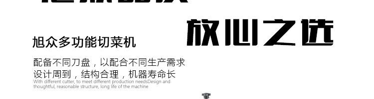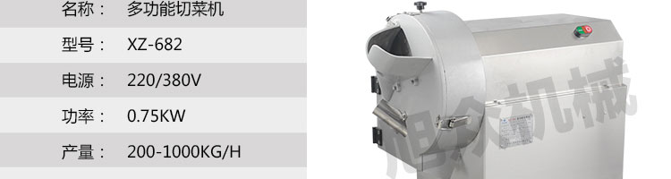 名稱XZ-682多功能切菜機 電源220/380V(見機器銘牌) 功率0.75kw 產量200-1000千克/小時 尺寸770*460*800mm 重量140kg 規格標配刀具尺寸:切絲:3mm,切片:3mm,切丁:10*10mm??蛇x的刀具尺寸:切絲:4、5、6mm 其他